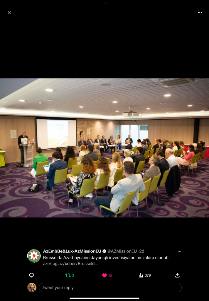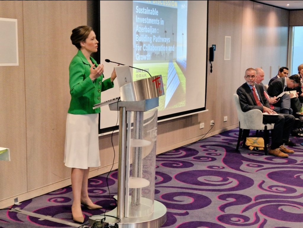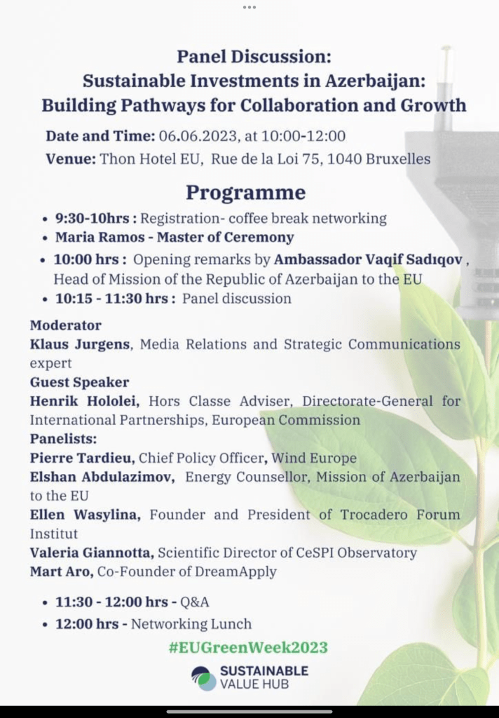 During this panel, Ellen Wasylina had the opportunity to speak about sustainable investments and pointed out three areas where Azerbaijan should invest : in renewable energies, in R & D, in digitalisation and in Education, referring to the recent Green Economy Forum that she co-organised in 2022 around three key areas : Recycling, Renewable Energies and Agriculture.
