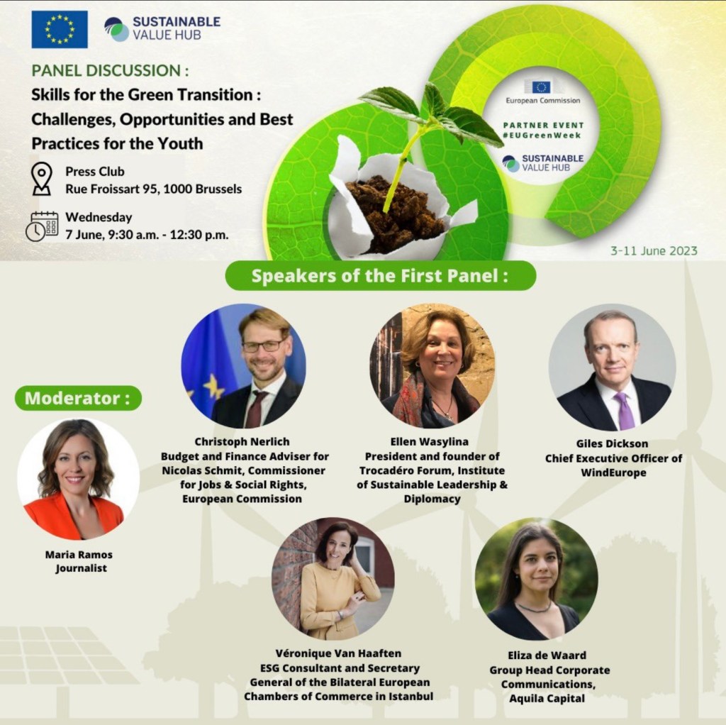The second event was held at the Press Club on June 7 and was entitled, « Skills for the Green Transition : Challenges, Opportunities and Best practices for youth ». In this panel, Ellen shared her perspective of a seasoned business executive and entrepreneur , and from an educator’s point of view and explained why she founded the Trocadéro Forum Institute, to train the next generation of leaders in Sustainable Leadership and (cultural) Diplomacy.