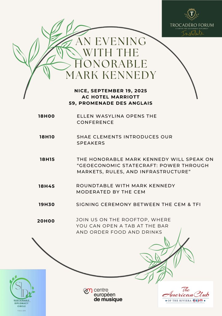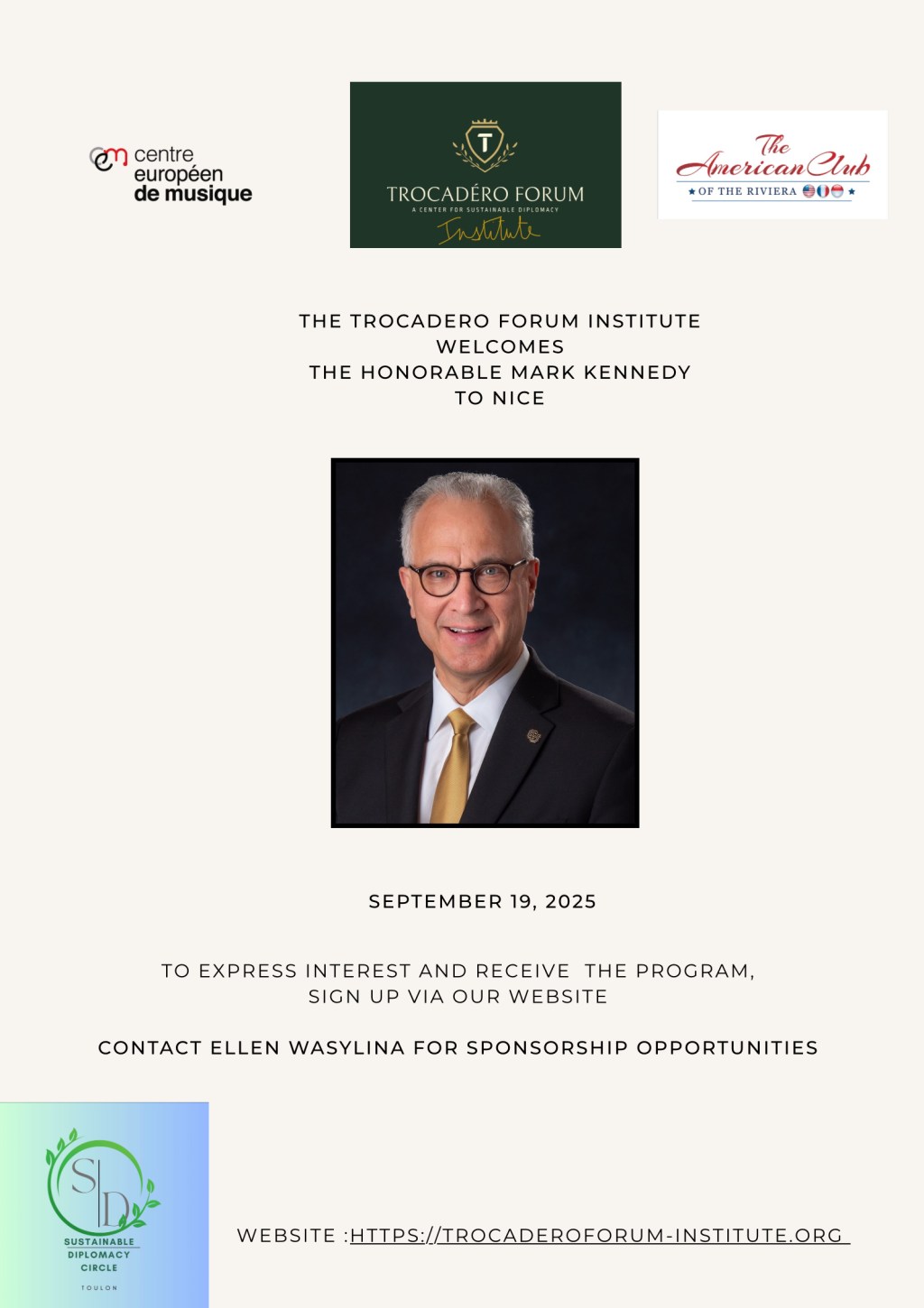 We are pleased to announce our partnership with the Centre Européen de Musique (CEM) and the American Club of the Riviera, who will support our event on September 19 to welcome The Honorable Mark Kennedy to Nice .